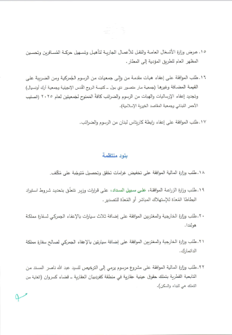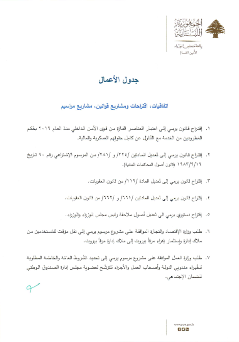 وطنية – يعقد مجلس الوزراء جلسة عند الساعة الثالثة من بعد ظهر اليوم، في القصر الجمهوري في بعبدا، للبحث في المواضيع الواردة على جدول الأعمال :